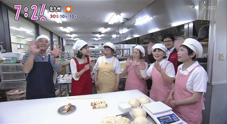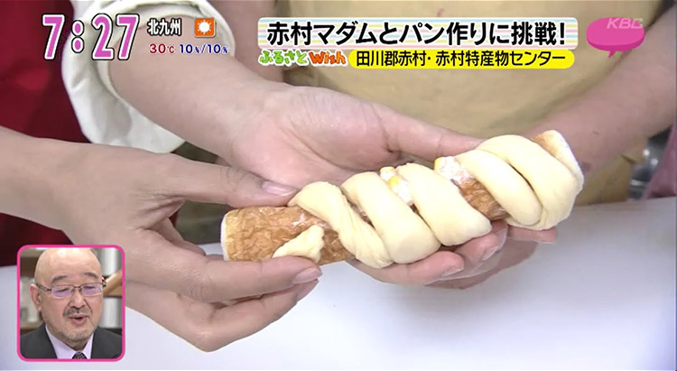 オリジナルパンも多く、イチ推しは手作りパン。AKAの“センター”道寿子さんが、大人気の「チクワパン」の作り方を教えてくれて、リポーターたちが手作り体験することに。材料はいたってシンプル。チクワをタテにカットして、シーチキンとめんたいマヨネーズ、コーンを詰めるだけ。そこへ、細く伸ばしたパンをくるくると巻き付けると完成です。「意外な組み合わせだけど、中身を聞いただけでも絶対おいしいよね!」とスタジオがざわつくなか、その場で焼き立てをガブリ。「ん~おいしいです。人気パンというのも納得!」とリポーターたちも絶賛。見ているだけで、ぐ~ぐ~おなかがなりそう!組み合わせの意外性と、見た目のインパクトが「チクワパン」の魅力ですね。