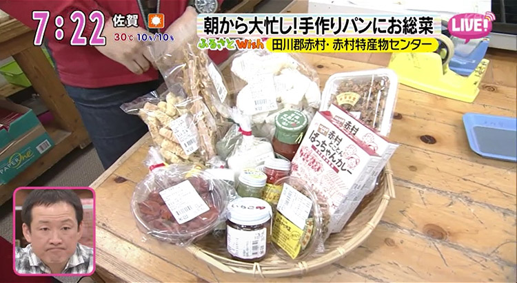 「赤村特産物センター」は、赤村内でとれた新鮮な野菜や果物などの農産物をはじめ、加工品や手芸品など、ジャンル豊かな「赤村ブランド」がそろっています。「見てください!こんな大きなレタスがこの価格!」と石井リポーターがビックリするほど、みずみずしい大玉レタスが格安。ほかにもソラマメや甘夏など季節の野菜やフルーツが、ずらりと並んでいます。「敷地内の加工場で作られたパンや総菜もたくさんありますよ!休憩場も隣接しているので、ここで購入したものをゆっくり食べてくつろぐこともできるんですよ」となるみレポーター。「赤村の自然を楽しみながら食べるのもいいですね」と、スタジオも興味深々な様子です。