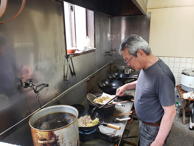 ちゃんぽんを作る店主の川嶋友文さん。手前に見える寸胴が、旨味を重ねた鶏ガラスープ