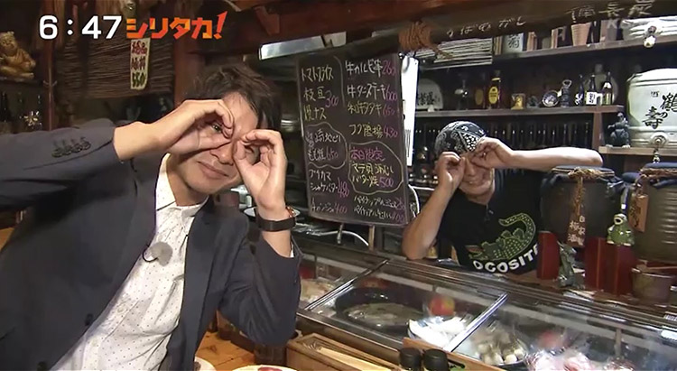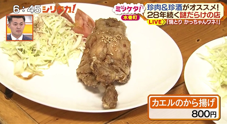 すかさず、もう一つの名物が出されました。ありのままの姿をした「カエルのから揚げ(¥800)」です!「これはもう何の肉か、すぐ分かる!」、「まんまでしょ!」とスタジオが沸く中、手で持ってかぶりつきます。「あっさりして、ちょっと白身魚に近い味です」とこれまた意外なおいしさにビックリ!一瞬、ひるんでしまいそうな珍肉ですが、実はとってもおいしいんです。しかも広川さんは、新鮮な地元野菜、地鶏は厳選した宮崎産と、素材や味にもこだわる料理人。ふざけている訳ではないのです。