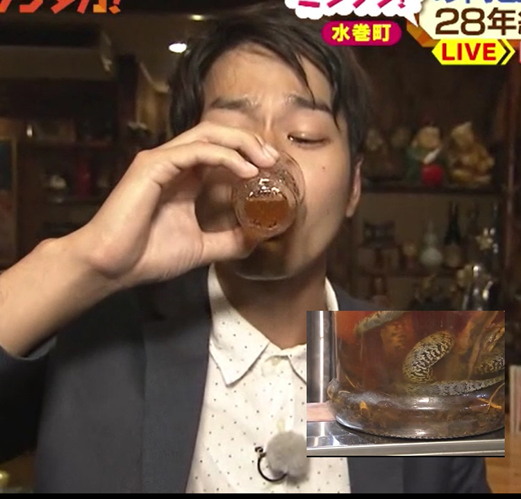 「これも人気なんですよ!」と最後に紹介してくれたのは、いかにも怪しい姿が浮かぶ「滋養強壮特別酒」。マムシやタツノオトシゴ、高麗ニンジンなどが入った、スタミナがギンギンの元気酒だそうですが、1杯300円とお手頃価格。「すごいにおいがします!いただきます!」と一気に飲み干すカイラ。大丈夫…?「あぁ~!元気が出る味ですー!!」と思わず雄たけびを上げるような味だったようです。