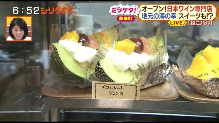 さらに、こちらのバルでは、なんとスイーツも用意。カウンターにあるショーケースには、プリンやゼリーをはじめ、フルーツをふんだんに使ったスイーツが並んでいます。中には、メロンの上にたっぷりのクリームやフルーツがのった「メロンボート」(520円)という豪華な逸品も!