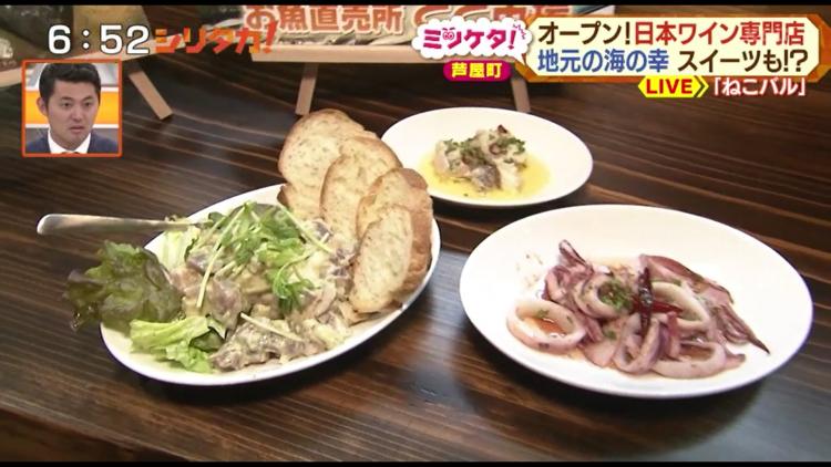 そして、ワインだけでなくもちろん料理にもこだわっています。芦屋町には2つの漁港があることから、海の幸を使った料理が自慢だそう。近くの直売所「とと市場」でも新鮮な魚を買い求めることができますが、実は同店では、洋子さんのご主人・通称“ジョン”が釣ってくる魚も使っているのだとか! 今回準備していただいたのは、「イサキのコンフィ」「マグロとアボカドのタルタル」「玄界灘ヤリイカのソテー」の3品でしたが、どれもおいしそう。それを見たスタジオからは「ワインに合うやつ~!」と歓声が上がっていました。