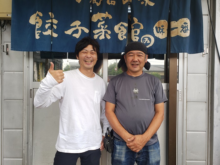 「餃子菜館」の店主・矢ヶ部政則さん(右)と筆者