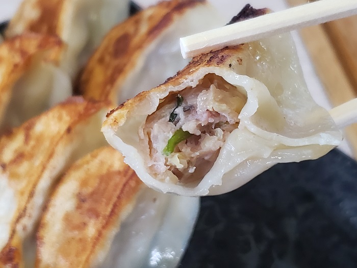 野菜多めの自家製餃子。鉄板に面した方はカリカリ。上はモッチモチに
