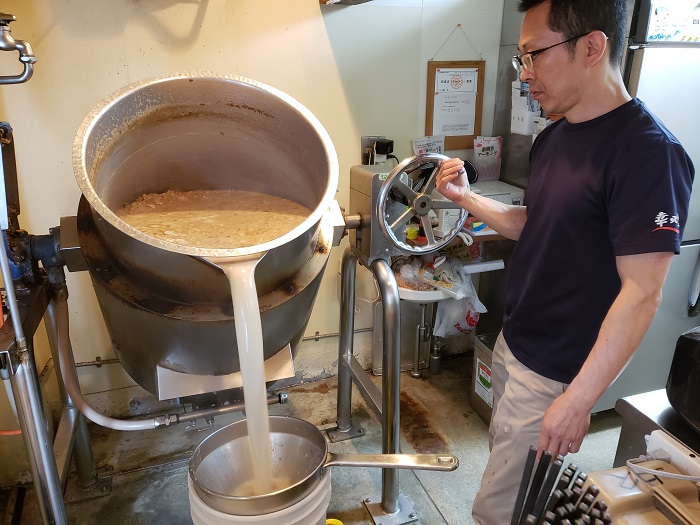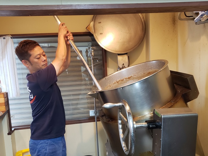 スープケトルで50kgの豚骨を煮込み、頻繁に棒で叩き旨味を絞り出す
