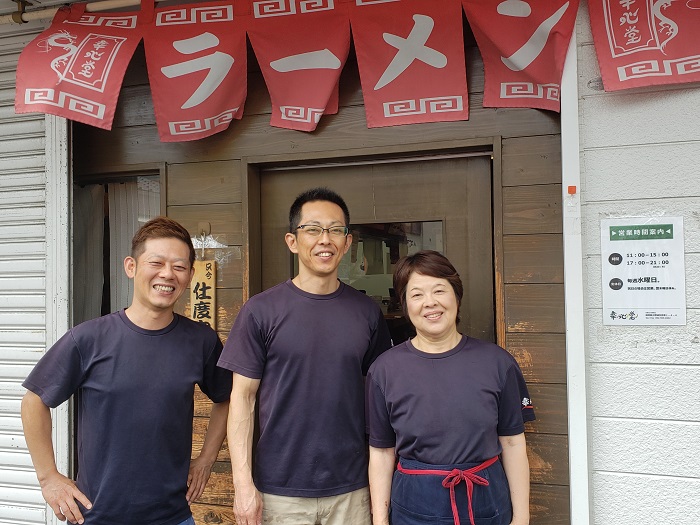「幸心堂」の藤野亮一さん(左)、兄の和哉さん(中)、母のトモ子さん(右)