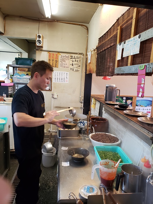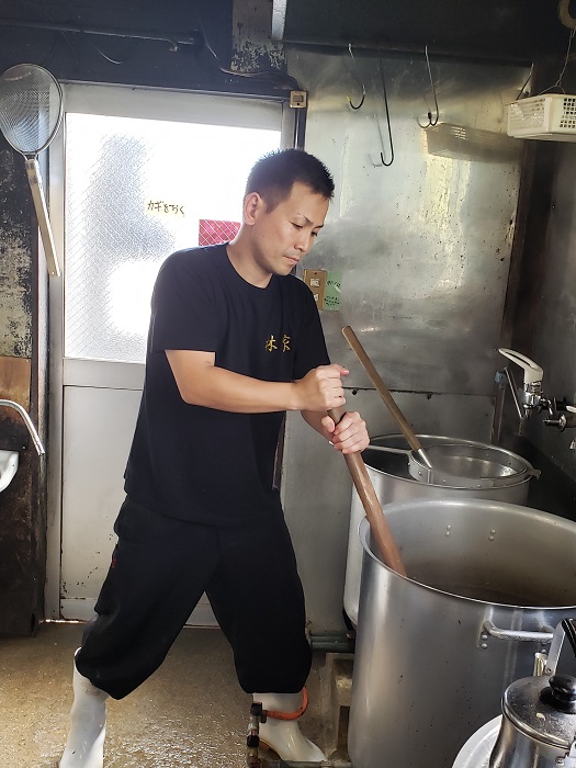 「林家」店主の林祐介さん。木の棒で混ぜながらゲンコツの旨味を絞り出す