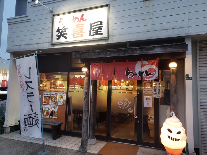 ラーメン激戦区R202の「笑喜屋」。店裏に無料駐車場がある