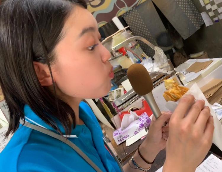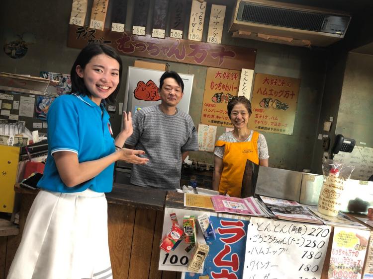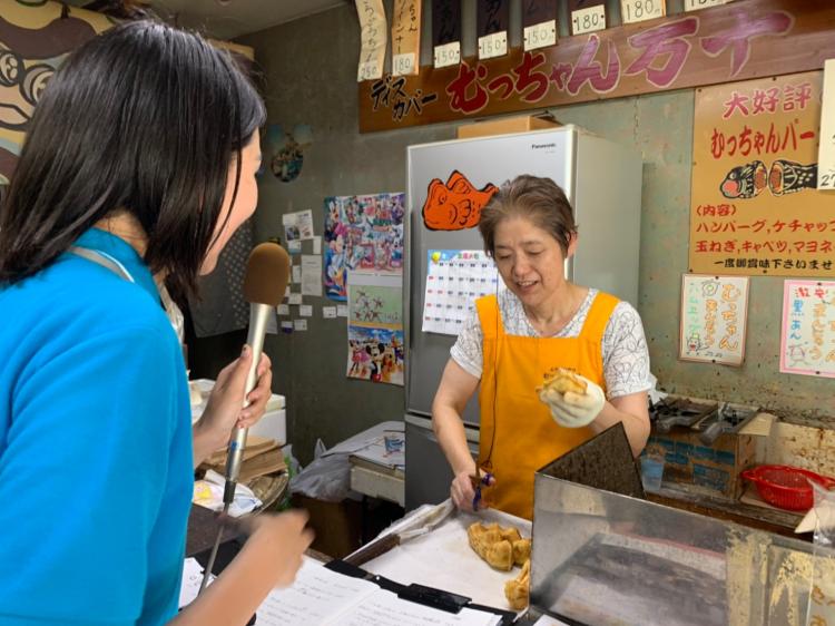 この日のハラミキは、いつもハムエッグだから初めての味を…と「ごろごろちゃん」(250円)に挑戦!「ひと口に、タコが2、3個入ってきます!」とサービス満点なたこ焼き風むっちゃんに、新境地を見出したようです。スタッフの大庭紀子さんは、この道うん十年(お察しを)。社長も「こんなにきれいに焼ける人はいない!」と太鼓判を押す、焼き手のスペシャリストです。複雑な形のムツゴロウ型は、熟練の職人でもきれいに焼くのが難しいそうですよ。