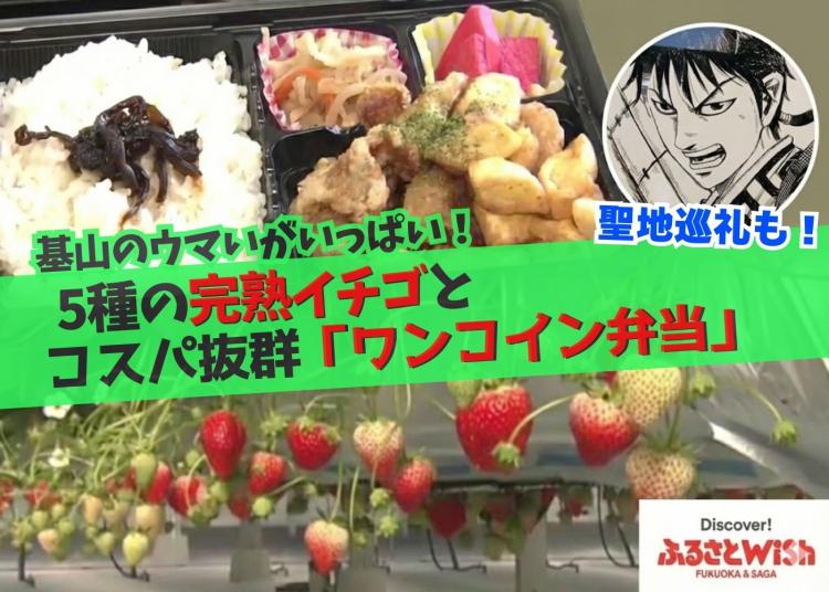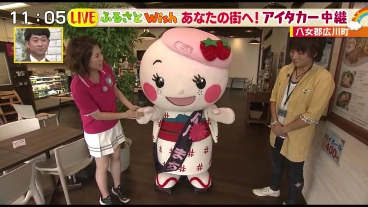 レポーターのアイタガール田代梓奈が店に入ると、そこで待っていたのは広川町の公式キャラ・広川まち子ちゃん、と通訳兼マネージャーの靍田雄三さん。まち子ちゃんは、とってもおしゃれ!久留米絣を身にまとい、帯留めは町特産のガーベラ、ベレー帽に付いている飾りはこちらも特産のイチゴ「あまおう」です。