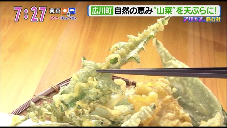 山菜を知り尽くしたご夫妻が広川の山で収穫した山菜を天ぷらに。天ぷらは時子さん担当