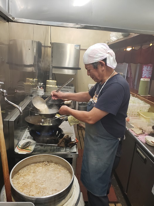 「一天愛」店主の岡田数広さん。手前に見える羽釜の豚骨×鶏ガラスープがラーメン、ちゃんぽんの基本になる