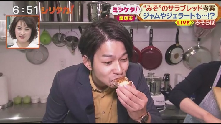 営業企画を担う、安藤祐基さんが味噌の加工品を紹介してくれます。「え~おしゃれなビン!」とスタジオが驚きます。ズラリと並んだ商品は、写真映えしそうな可愛らしい瓶詰の味噌。でも、味噌の色合いとはちょっと違った印象です。それもそのはず、「いろいろな変わった味噌なんですよ。ショウガとタマネギ、エビとトマトなど、素材を掛け合わせた味噌なんです」と安藤さん。早速、カイラくんは、「エビとトマトのみそソース(281g972円)」を試食させてもらうことに…。