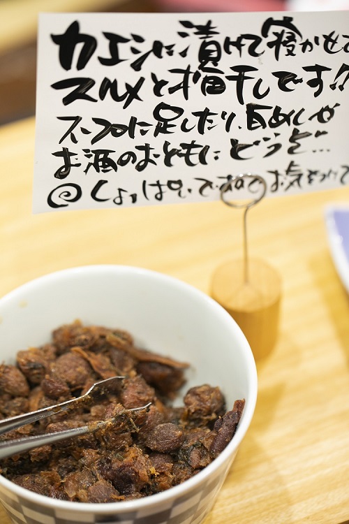 鯛ラーメンは、ほんのりとした梅風味の煎り酒が元ダレとして入っている。梅風味を足したい時は、カウンター上にある“梅スルメ”を