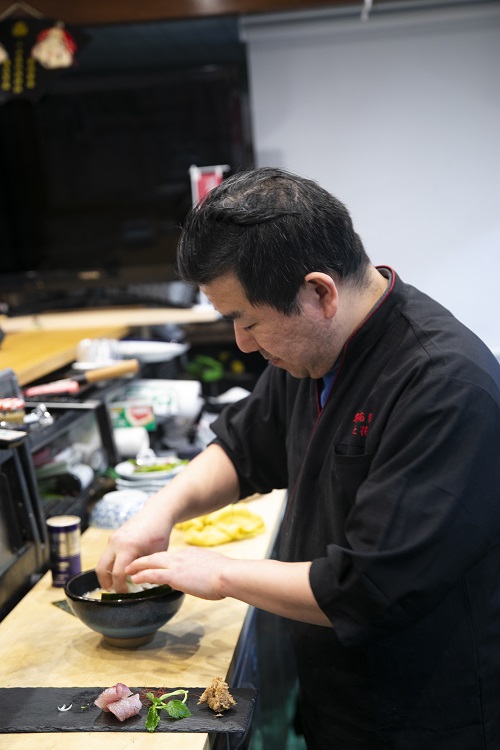 店主の西原良史さん。創業約40年の「一力寿司」を継承。寿司コースと合わせてお祝いサプライズサービスを行う「おもいで屋」も手掛け、これまで3,000組の客を祝った