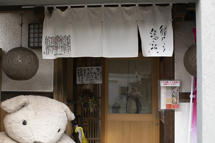 糸島市高田の裏通り。白い暖簾と大きなぬいぐるみが目印