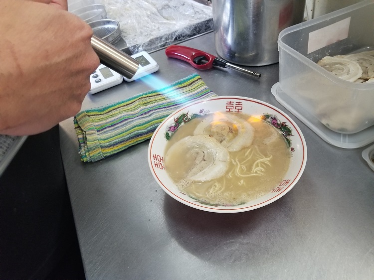 豚バラチャーシューを注文後に炙る。肉汁と香ばしさがスープに染み出し美味