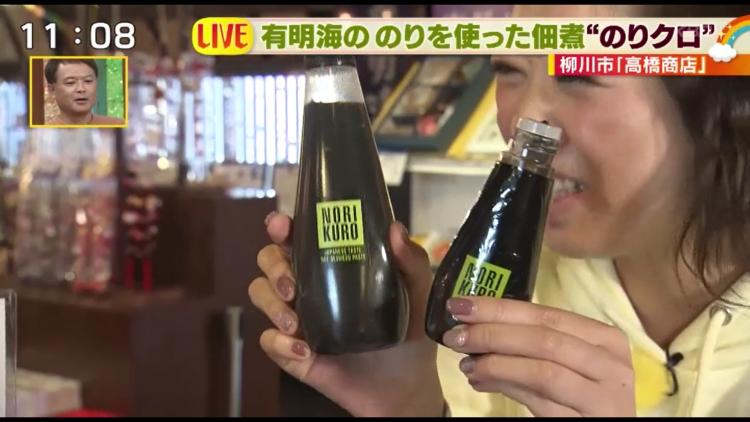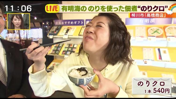 その中でも今一番の推しは「のりクロ」。有明海の海苔をふんだんに使い、ゆずこしょうを効かせた海苔の佃煮です。チューブタイプなのでご飯にかけやすい!ひと口がひと口じゃないアイタガールの田代梓奈リポーターも、ぱくり。「海苔の香りはもちろんですが、ちょっとピリッとしていて、ご飯によく合います!」と絶賛。