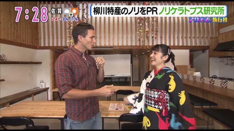 教えてもらった場所に行ってみると、とある建物の中に「恐竜の着物を着た人が!」とボビーが発見。中に入ってみると「え、サクちゃん?サクちゃんがノリケラトプス?」とボビーはとても驚いた顔をして、着物姿の女性に矢継ぎ早に質問します。「久しぶり、ボビー!」と笑顔で返事をしてくれたこの女性、実は福岡や東京でモデル活動をしていたことから、ボビーのモデル仲間だったという、黒滝サクさん。「今はノリケラトプス研究所という名前で、ノリのブランドをやっています」と生き生きとした表情で話すサクさんと久々の再会を喜ぶボビーでしたが、そばにあるノリを使ったオリジナル商品のことも気になります。