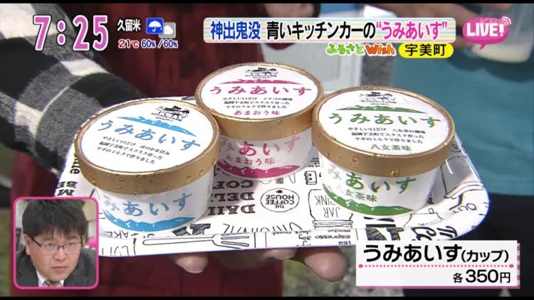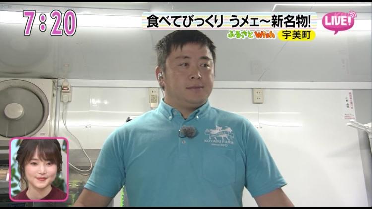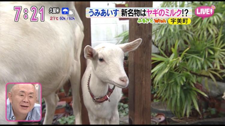 あいにくの雨の中、爽やかなブルーのシャツを着たオーナーの小林孝昭さんが差し出してくれたのは、一見普通のソフトクリーム。「さっぱり!甘味はあるけど、後味がスッキリしたソフトクリームです」と服部リポーター。その横では、何やらチラチラと白い体が見え隠れ…。「それって牛のミルク…じゃないよね?」と思わずスタジオからツッコミが入ります。「そうです!珍しいヤギのミルクを使った、うみあいす」というソフトクリームです」と苦笑いする石井リポーターと共に、正体を現したのは親子ヤギ。「ヤギミルクだといわれなければ分からないほど、クセもなくって、あっさりしているのにコクがあって、ほんの~り甘いんです!」と絶賛する服部リポーターのコメントに被せて、「ウンメェ~!」と鳴き声を上げるヤギたちに、「まるでハイジみたい!」とスタジオも大盛り上がり。