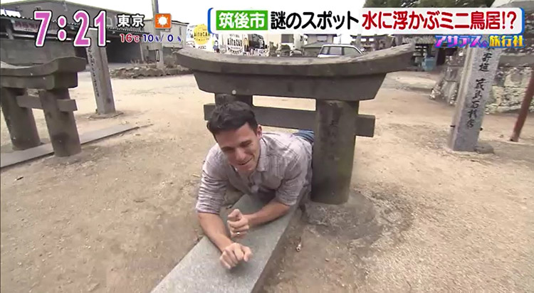 リポーターのボビーが最初に向かったのは粟島神社。筑後市の中心部にほど近い六所宮境内にあるこの神社には、2つの小さな鳥居がありました。どちらもボビーの膝丈ほどの高さですが、しっかり鳥居の形をしています。「え…これをくぐるの?」と困惑しつつも、鳥居をくぐろうと腹這いになりながら四苦八苦するボビー。