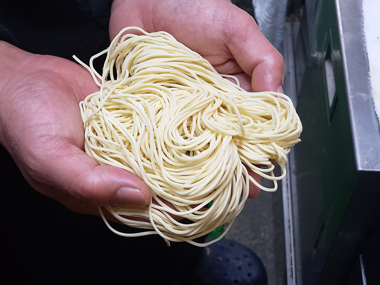 田島さん「麺まで作ってこそ真のラーメン店。10年ほど前に自家製麺に切り替えました。いつもの仕込みに製麺という手間が増えましたが、何より自分好みの麺を自由に作れるのがメリット。気温や湿度で仕上がりが変化する麺と対話しながら、愛情を注いで作っています。麺の茹で加減には各自好みがあるでしょうができればバリカタではなく“普通”で味わってほしい。麺の芯に程よい食感を残し、かつ周りがトロリと絡み付く最高の茹で加減でお出ししますよ」。