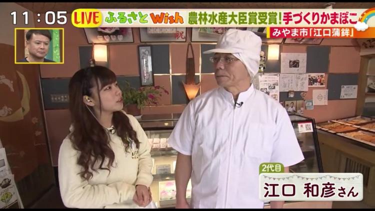 すり身の練りから板付け(かまぼこの板にすり身をのせる)、蒸しまで、すべての工程で昔ながらの手造りをする「まんよう」。2019年に行われた第71回全国蒲鉾品評会で、最高賞の農林水産大臣賞を受賞した逸品です。1本1800円。一般的にスーパーで売られている蒲鉾は1本100円ちょっとで。「なかなかにいいお値段しますが。。?」と来亜リポーターが弱冠心配そうに問いかけると、「その分、十分おいしいと思います!」と江口さんはゆるぎない自信をのぞかせます。
