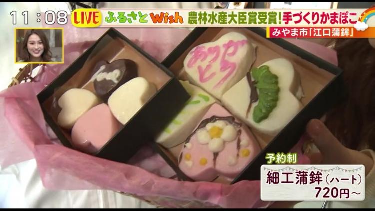 同店では、シーズンに合わせていろんな形のかまぼこも出しています。今は「バレンタインですね」と江口さん。すると、ハート型でラブリーなかまぼこが登場。甘いものが食べられない方や、普通のものでは満足しないような方にぴったりですね。「この愛は溶けません!」というキャッチフレーズも最高です!