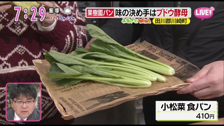 正解は、ぶどう。「『博多ホワイト』という、福岡県のブランドぶどうです。希少品種で、それをふんだんに使って酵母を作っています」と、IKURI代表の篠﨑海太郎さん。この自家製酵母を使ったもう一つのおすすめが「小松菜食パン」(410円)。めちゃくちゃきれいな翡翠色のパンに、スタジオもリポーターたちもびっくり! なんと1斤に、小松菜を約5把使っているといいます。実は篠﨑さん、この川崎町産の小松菜に魅せられて移住したそう。「採れたてがおいしすぎて引っ越しました!」と言うほど“違う”小松菜、ぜひ食べてみたいですね。