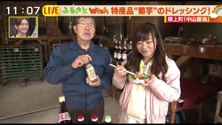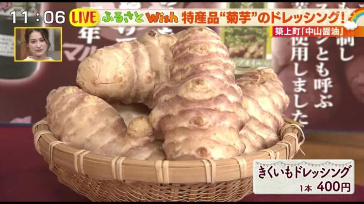 3月2日放送のKBC「サワダデース」のアイタカー中継にご登場いただいたのは、同醸造元3代目の中山一郎さん。「ドレッシングには、うちの醤油を使っています。特産品の菊芋をドレッシングに使えないかと思って作りました。菊芋と玉ねぎ、オリーブオイルを入れて、子どもやお年を召した人でも食べやすいような味にしています」