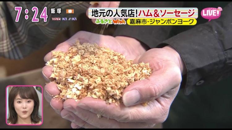 機械で削り出されているのは、木のチップ!「これはハムとソーセージの燻製に使うものです」と、店長の福山敬悟さん。「自分でチップにした方がいいんですか?」と石井裕二リポーターがたずねると「そうですね、香りが全然違います。私のところでは、風倒木などを近隣の方に分けていただいています」と説明してくれました。地域の人とのつながりも、商品づくりに欠かせないのですね! さらに、水にもこだわっているそう。「地下からくみ上げた水を使っています。塩味に丸みが出て、まろやかに仕上がるんです」と福山さん。成形も手作業で、一つ一つ丁寧に作り上げます。外の煙突からはモクモクと煙が上がり、「燻製の香りがしていますよ~!」と原直子リポーター。スモークにかかる時間は1時間以上だといいます。