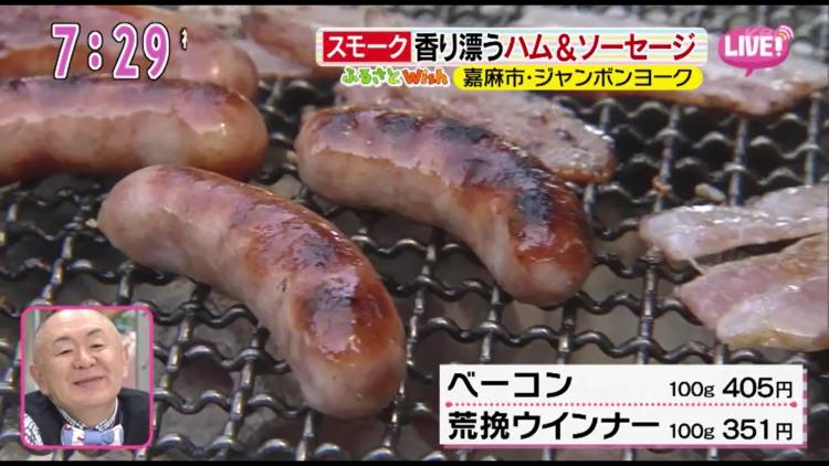 こうして出来上がったハムを、ぜいたくにも切りたてでいただきます!「香りから違いますね!匂いだけで飲めそう」と原リポーター。七輪で焼かれたベーコンとウインナーもおいしそうです。「うわー、味が凝縮されてる!そして、塩味が本当にまろやか。肉汁がジュワ~~っと出てきます!」と、おいしさに目を見張る石井リポーター。「焼くとより、燻製の香ばしさが出ますね!」と原リポーターも、お箸が止まらない中継でした。