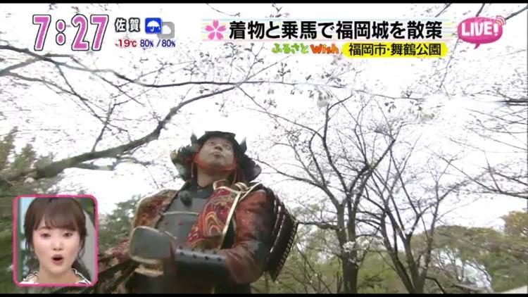 福岡有数の桜の名所・舞鶴公園の福岡城跡。石井リポーターは甲冑姿、芽瑠ちゃんは袴姿で登場!桜色の着物に紫の袴がよく似合うめるちゃん。2000円ほどから着物をレンタルして散策を楽しむことができるそうです。芽瑠ちゃんが着ていた袴は、ヘアセット込みで5000円ほど!思い出作りにぴったりですね♪ちなみに、石井リポーターが身に着けている甲冑はデザイン重視なので、ちっとも重くないそうです。