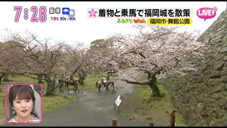 桜散策の楽しみ方のひとつとしてご紹介したのは、乗馬体験「福岡城サムライライディング」!実は乗馬ライセンスを持っているという芽瑠ちゃんも、さっそうと馬に乗ります。馬上では、桜の花が顔のすぐ前に!乗馬体験は約5分のお気軽コースから、約30分ののんびり周遊コースまで、いろんなプランがあるそうですよ♪