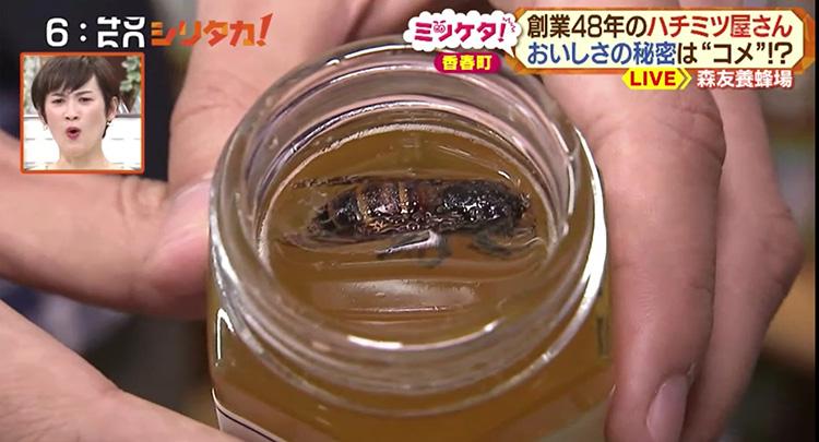 カイラくんが訪れたのは、創業48年の「森友養蜂場」。香春町で採れる天然100%の純正ハチミツの販売も行っています。甘い香りで満ちた店内には、たくさんの種類のハチミツが並んでいます。中には、珍しい「白い結晶はちみつ(純粋百花蜜)」や「ハイパワーZ」という1万円する高価なものも。とくに目を引いたのは、「スズメバチ蜂蜜漬け」。その名の通り、ビンの中には、丸々1匹のスズメバチが鎮座!スズメバチから出るエキスが滋養強壮に良いのだとか。
