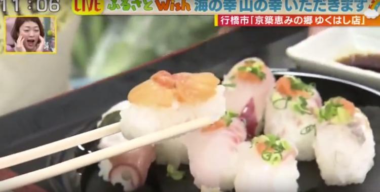 同店は、行橋市内3か所のJA農産物直売所が一つになり、2019年にオープン。地元産の農作物や魚介類がたくさん並んでいます。「コチ、クロダイ、アジ、カサゴ、カキ、サザエ、ナマコになります」と鮮魚担当の田崎栄七さんが紹介してくれました。豊前海の恵みが盛りだくさんですね! 地魚を使ったお寿司も販売。おススメの赤貝を試食した田代リポーター、「コリコリしていておいしいです、最高!」と、つい大きな声が出てしまいました。ネタが新鮮なことに加え、8貫で580円とリーズナブルなのも魅力です。