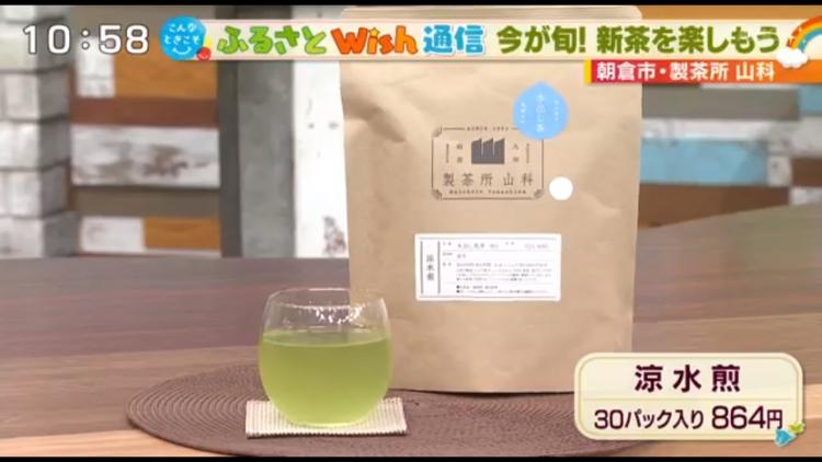 スタジオには、製茶所 山科の水出し茶「涼水煎(りょうすいせん)」が用意されました。新鮮な茶葉を遠赤外線でダブル焙煎しているので、香ばしさが抜群だそう。「まろやかで、すっきりした後味です。おいしい!」と沢田幸二アナ&加藤恭子アナ。味が濃く、美しい緑色が目にも涼しいお茶です。ティーバッグなので、簡単にお茶が楽しめるのもポイント。冷茶漬けにも使えるそうですよ♪