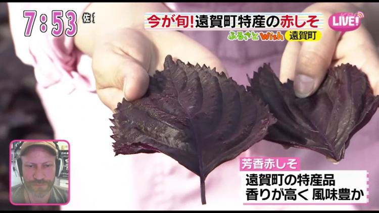 赤しそを作って20年の二村さん夫妻にお話を伺いました!「この“芳香赤しそ”は遠賀町の特産品です。香りが高くて、風味豊かなんですよ」。葉っぱも大きく、財津リポーターの手の平サイズ!ちぎるとマスク越しでも伝わるほどの、芳醇な香りが漂います。