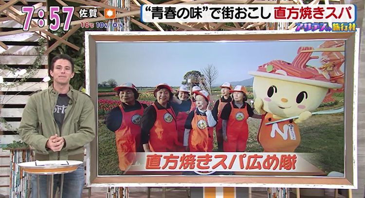 「焼きスパ広め隊」は、当時の味を若い人にも広めたいと、学校でレシピを教えたり県外でも活動している。焼きスパ広め隊と焼きスパマン(右)