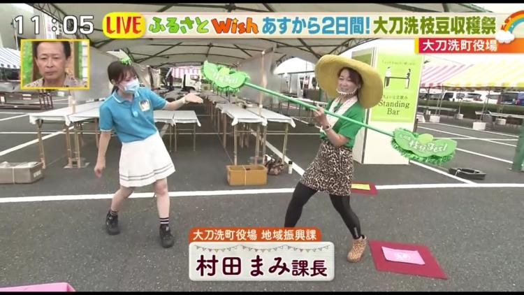 ここで大刀洗町役場の村田まみさんも加わります。村田さんが手にしているのは、枝豆モチーフが付けられた棒…?「枝豆ソーシャルディスタンス棒です!」なるほど~!楽しく2メートルの間隔を開けてもらうことができますね。