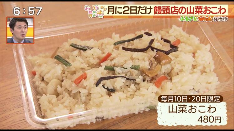JR行橋駅東口を出てすぐ。緑のひさしが目印の「德康饅頭」は、毎朝一つ一つ手作りしているふかし饅頭が自慢の店。でも、おまんじゅうに混じっておこわが並んでいますよ?「毎月10日と20日だけ山菜おこわを販売しているんです」と同店の日髙德子さん。仕込みが大変なので、月2回にしているそう。大人気で、すぐに売り切れてしまうといいます。
