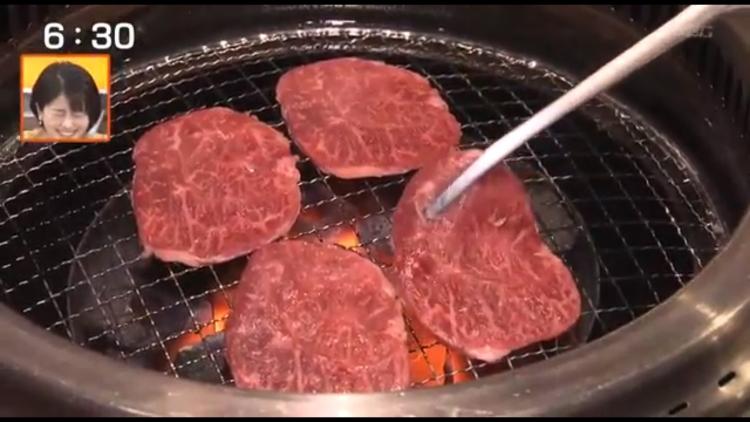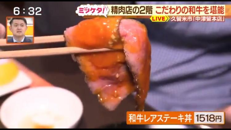 さらに登場したのは、“あまり知られていない”という今年からの新メニュー「和牛レアステーキ丼」(1518円)。長岡アナ、思わず「セクシーなお肉!」とひと言。いや、本当に官能的です。卵黄を割り、わさび醤油をかけ、肉でご飯を巻いていただきます。「最高です!たまんないです」とカイラ君。でしょうね!