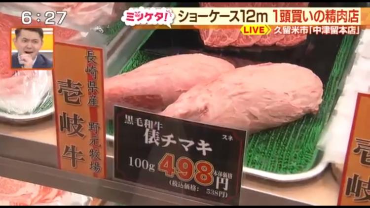 福岡県久留米市の「中津留本店」は、地元では知らない人はいない精肉店。約12メートルのショーケースに並ぶ牛肉は、すべて九州産の黒毛和牛!毎日せりで一頭買いをするといいます。