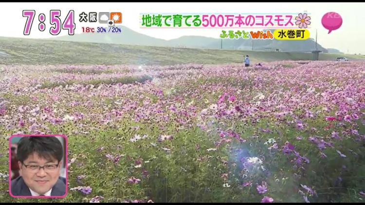百市リポーターの周りは、見渡す限りのコスモス!さらに遠賀川の河川敷約6キロにわたって、およそ500万本のコスモスが満開を迎えています。中継場所の水巻コスモス園から遠賀川に沿って遙か遠くまで、ずー――っとコスモスが連なる景色は圧巻!「きれいでしょう?よく見ると、淡いピンクに濃いピンク、白に、紫がかったものと、さまざまな色が咲いています」。1986年に水巻町の町の花がコスモスに決まり、2年後から遠賀川の河川敷で栽培がスタート。地域の人たちがボランティアで種まきから栽培、管理まで行っているといいます。