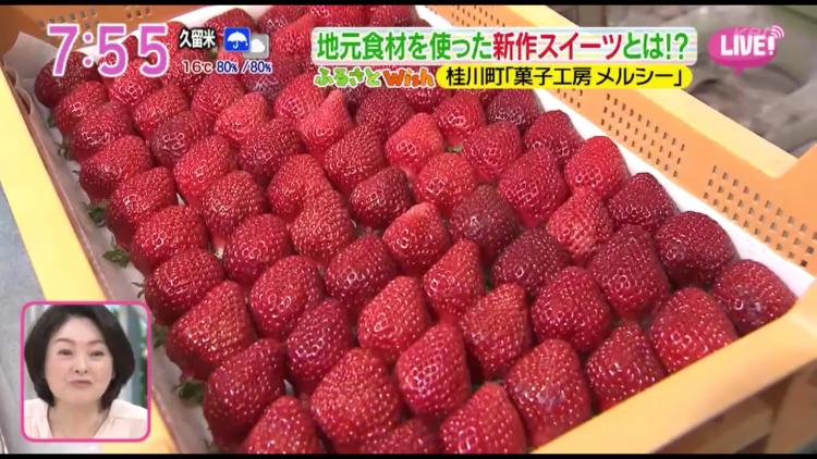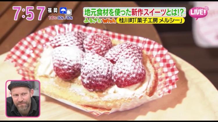 「K’s farm」(桂川町)のあまおうと、「古野農場」(〃)が合鴨農法で作った米粉を生地に使った、「いちごのオムレット」です。フワフワに仕上げたオムレット生地の上に、生クリームとイチゴをふんだんに乗せて仕上げます。「イチゴがフレッシュでスポンジがやわらか~い♪」と試食した三澤澄也アナウンサーも、口の周りにクリームを付けて絶賛(笑)こちらは3月17日(水)から発売予定です。