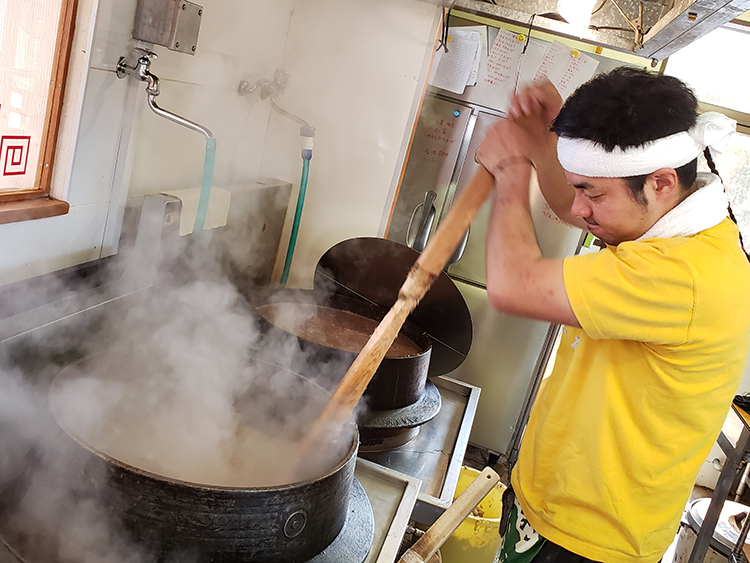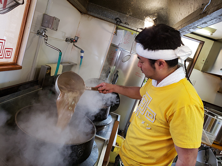 店主の北村和也さん。羽釜で炊く豚骨を混ぜ、旨味を絞り出す。 「“骨を炊き、カエシで味付けする”シンプルな豚骨ラーメンを追求したい」