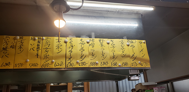 カウンター上に貼られたメニュー表。掲げられていないか替え玉(¥120)もオーダー可能