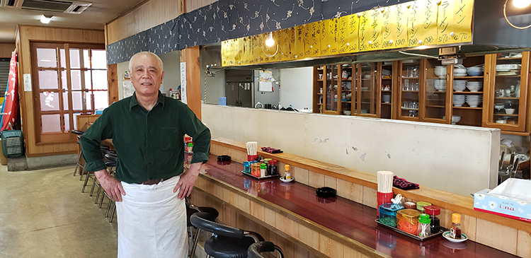 大将の小野忠隆さん(75歳)。宮崎県延岡市出身で、熊本を経て福岡県篠町へ。「体の続く限りラーメンを作りたい」