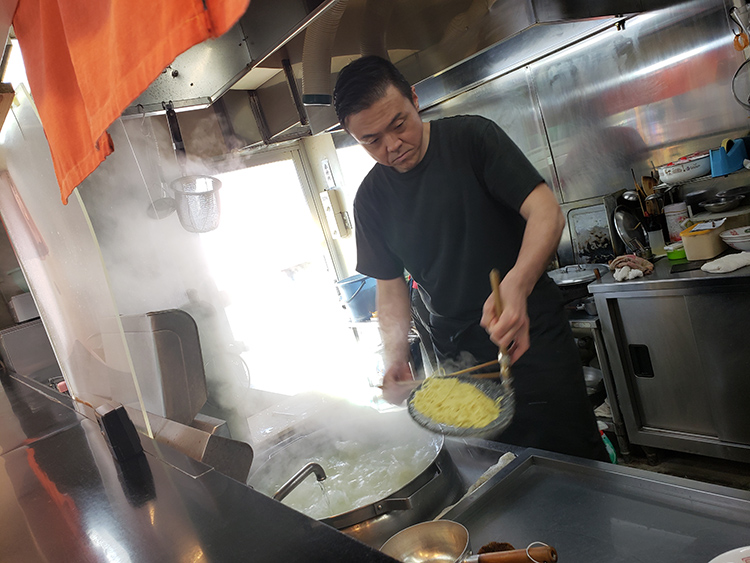 平網を巧みに操る2代目・池田健(たけし)さん。高校を卒業してすぐ店に入り、見よう見まねでスープ作りを始めた